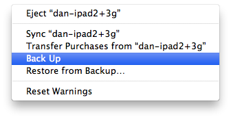 なお、この設定は一度やっておけばOKで、あとはバックアップ先をiCloudに指定している場合でもデバイス二本指クリックで明示的にバックアップをiTuneで取ることができます。Wifi同期を設定しておけばWifiでも。