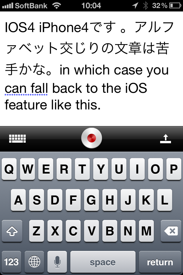 右の例では"iOS five"、"iPhone four-es"と英語読みしたときの例。ただしエンジン側で知っているものはきちんと認識するみたいで、"dragon dictation"と英語読みしても「ドラゴンディクテーション」とカタカナ読みしても"Dragon Dictation"と入力された。なお、見てのとおり iPhone 4S を使っている場合はOSネイティブの英語ディクテーションもキーボード経由でアクセスできる。