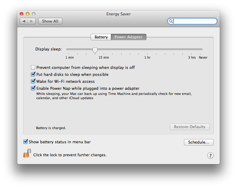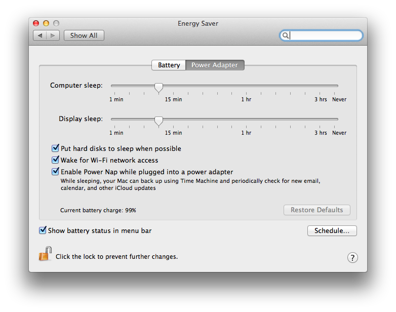 おそらくそれでいいのだろう。今回鳴り物入りで登場した Haswell の最大の特徴は、省電力モードの豊富さとのことだが、そうなるとむしろユーザーの側で何をどれだけどう細かく設定するかはわかりづらくなる。きめ細かい省電力はiOSデバイスでは常識だが、そのiOSデバイスも設定はほとんどない。放っとけば勝手に寝るし、その間もメッセージは受け付けるし、すぐに寝せたければロックボタンを押すだけだ。このロックボタンをクラムシェルのリッドに置き換えれば、今回の MacBook Air になるという感じ。放っとけば寝るし、蓋を閉じればすぐ寝るし、そして蓋を空ければすぐ目覚める。以前にあった「数秒の間」はどこかに行ってしまった。